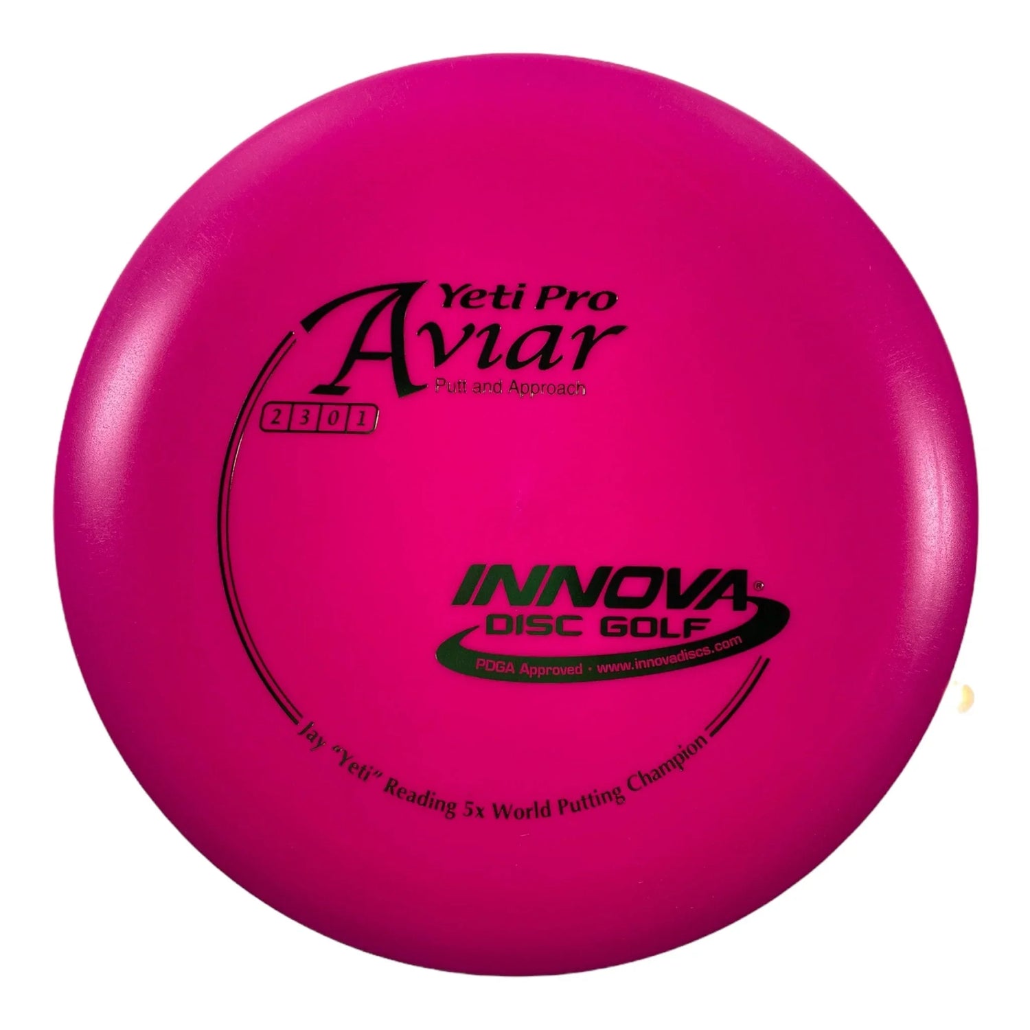 | The Yeti Pro Aviar is a straight flying putter. Innova developed the Yeti in a firm, grippy blend of Pro blend of plastic. It's somewhere between DX and R-Pro in both grip and firmness. The unique slightly concave top allows for a lower profile and a straighter flight than the other big bead models (KC Pro, JK Pro & Aviar Driver). The grippy firm plastic feels great in your hand in any weather. |
